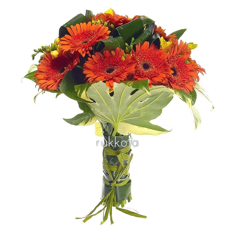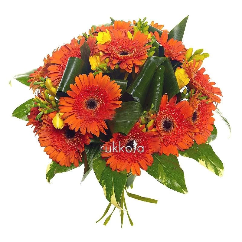 Букет оранжевых гербер и фрезий. Отборные цветы с доставкой. Флористы соберут букет из свежих гербер оранжевого цвета и фрезии с упаковкой или без, можем сделать в корзине. К цветам добавим конверт с запиской для получателя.