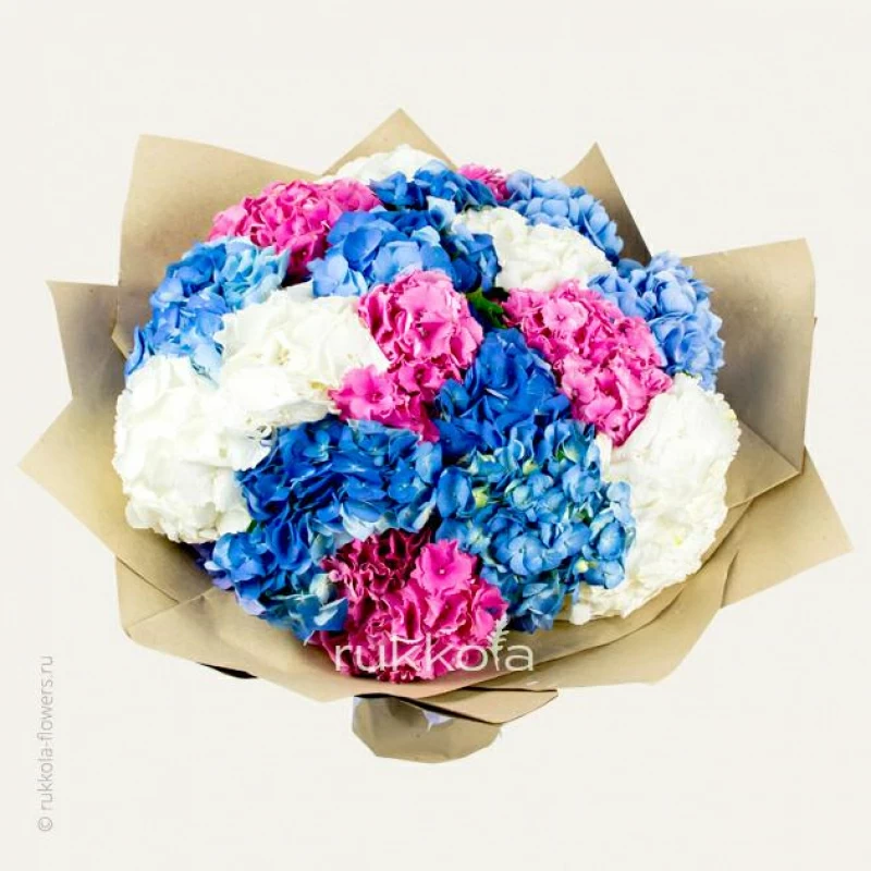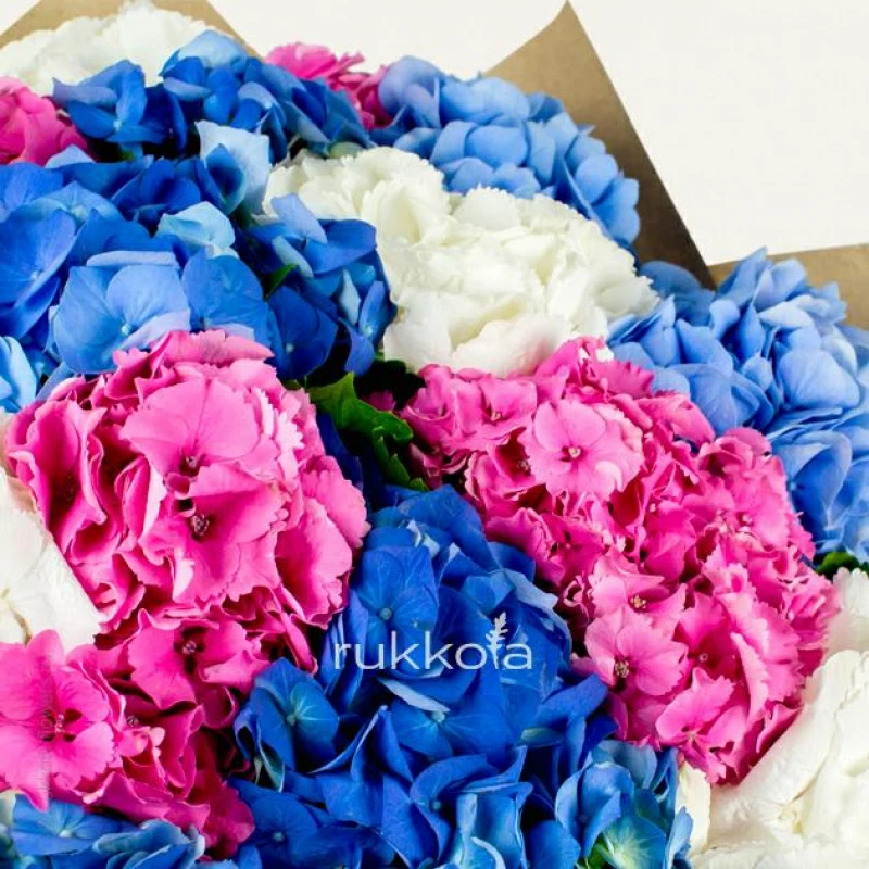 Букет свежих гортензий разного цвета. 19 отборных цветов с доставкой. Флористы соберут букет из свежих гортензий. К цветам добавим конверт с запиской для получателя.