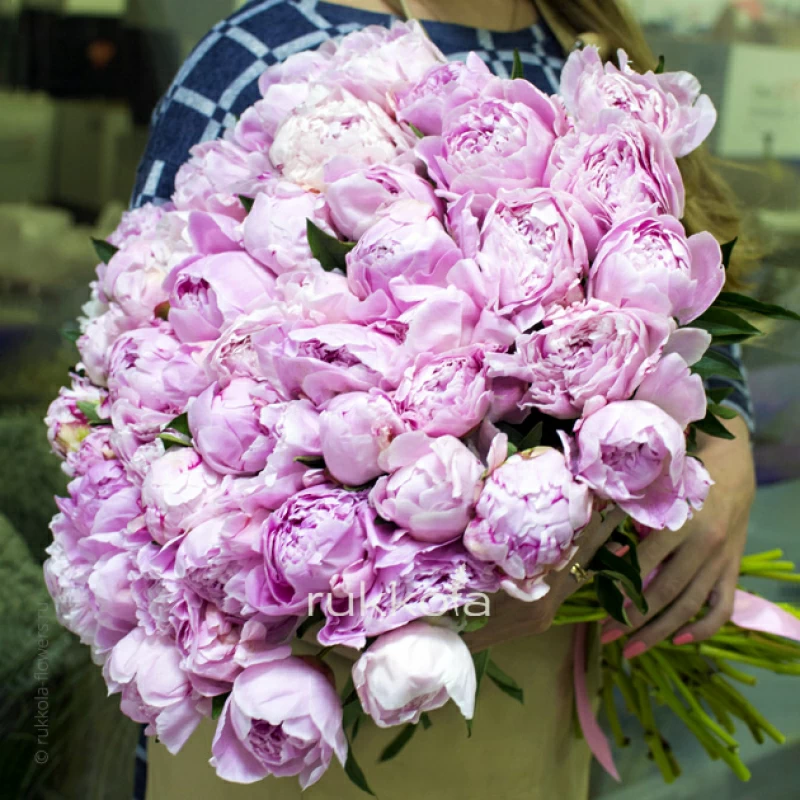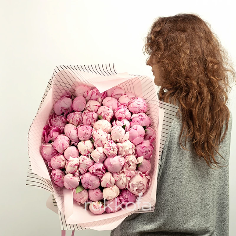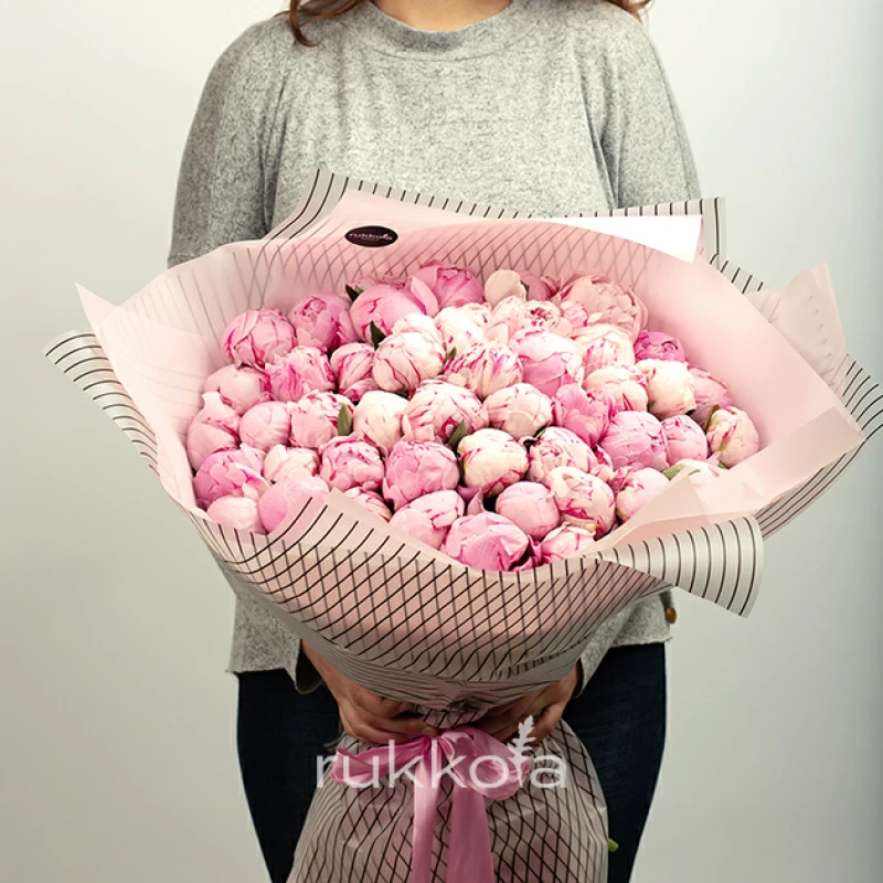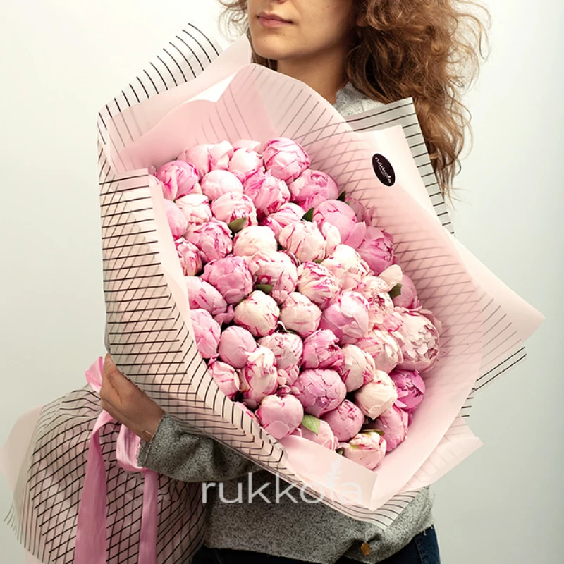 Букет свежих розовых пионов. 51 отборный цветок с доставкой. Флористы соберут букет из свежих розовых пионов. К цветам добавим конверт с запиской для получателя.