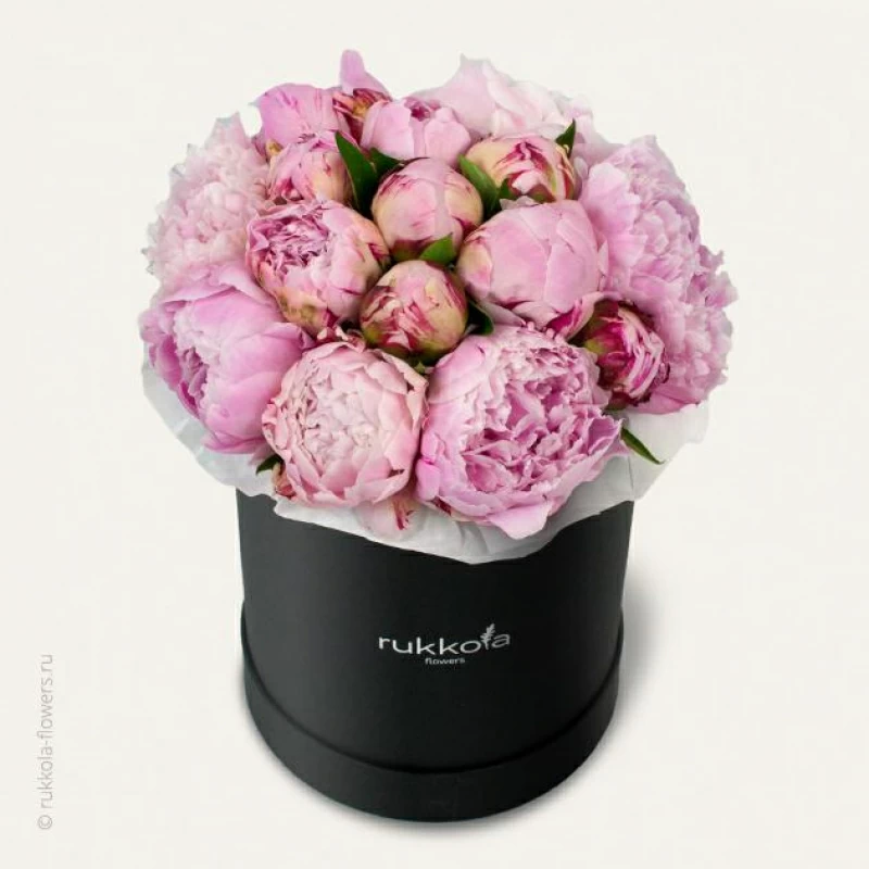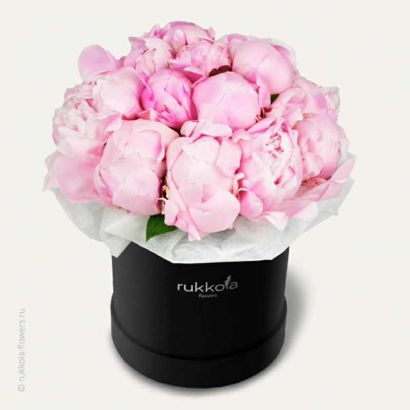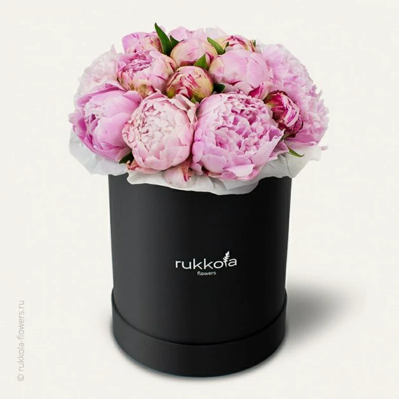 Шляпная коробка черного цвета с розовыми пионами. Отборные цветы напрямую от флористов с бесплатной доставкой в Москве. К пионам розового цвета добавим конверт с запиской для получателя.