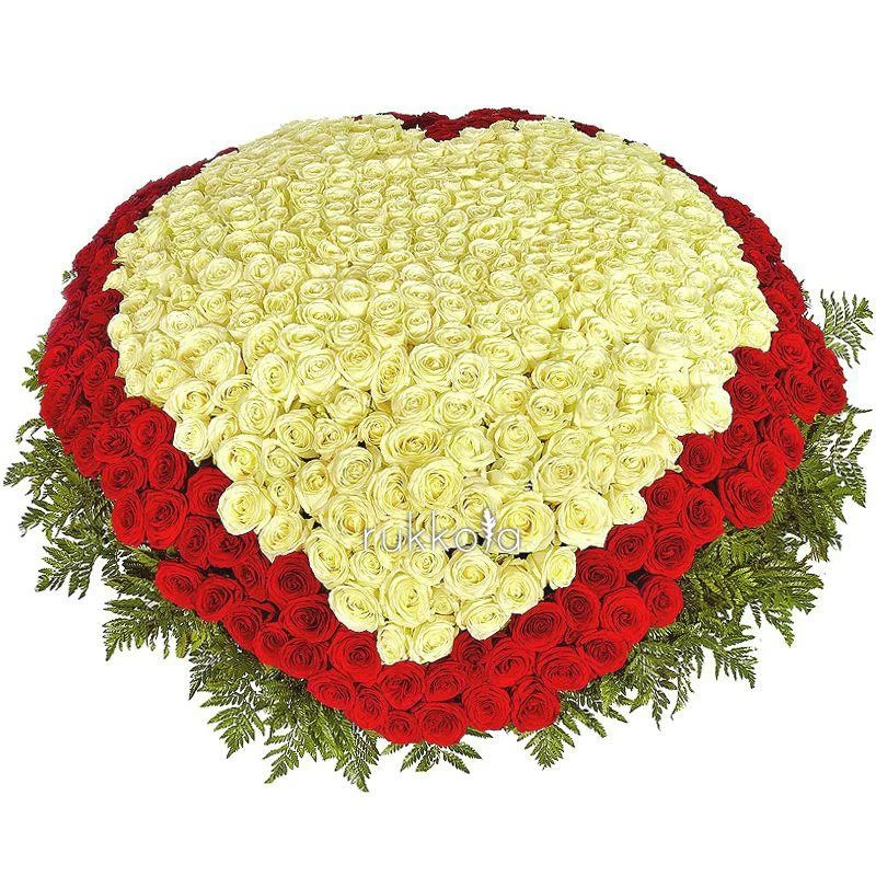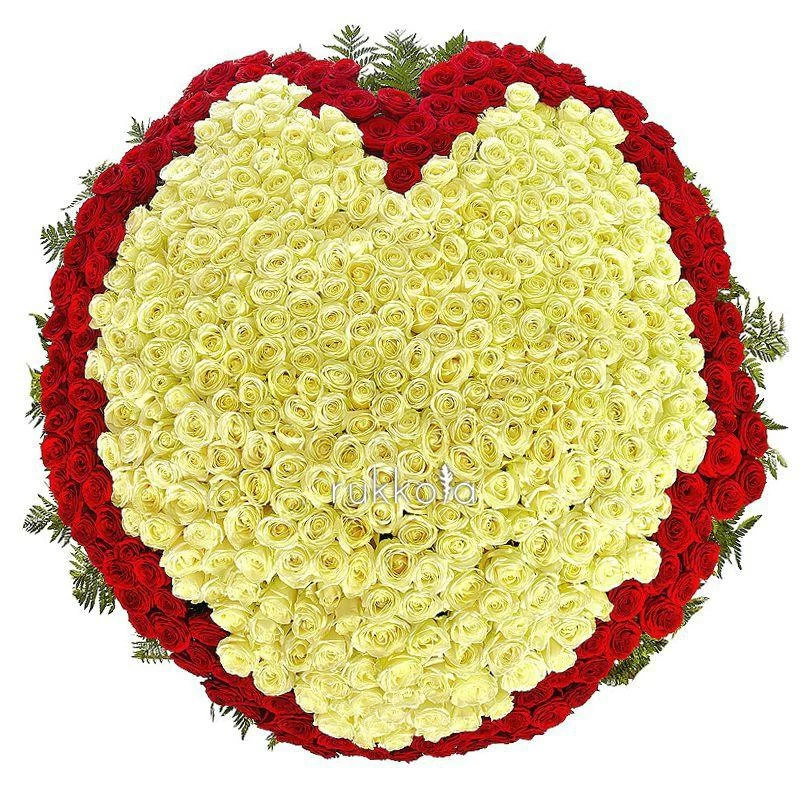Потрясающий букет в виде сердца из красных и белых роз