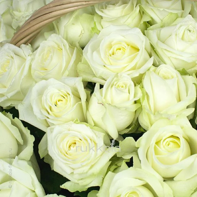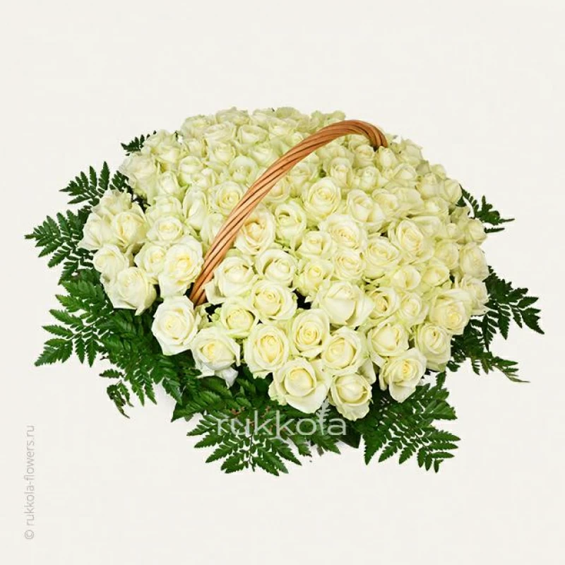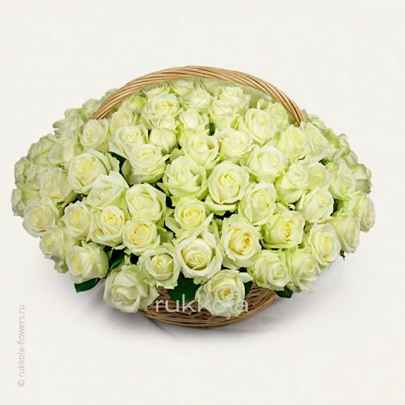 Букет свежих белых роз в корзине. 101 отборная роза с доставкой. Флористы соберут букет из свежих белых роз. К цветам добавим конверт с запиской для получателя.