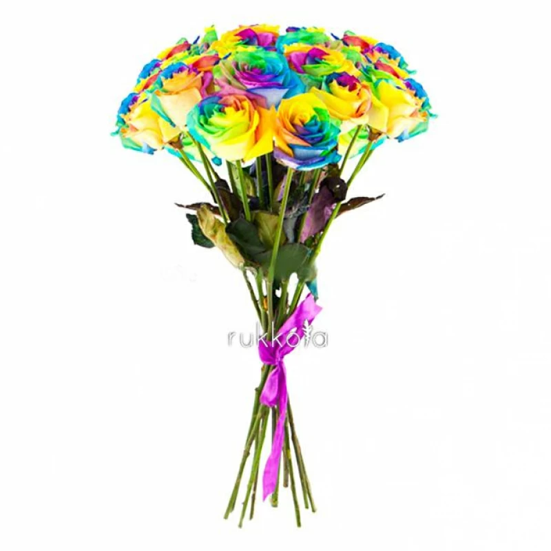 Букет радужных роз. 15 отборных цветов с доставкой. Флористы соберут букет из свежих разноцветных роз с упаковкой или без, можем сделать в корзине. К цветам добавим конверт с запиской для получателя.