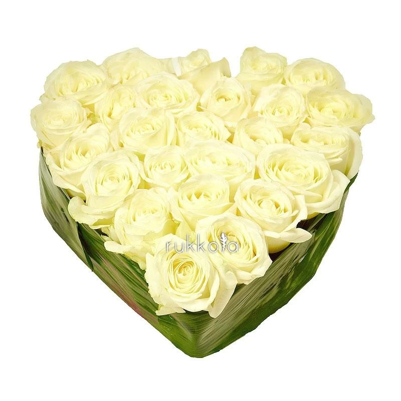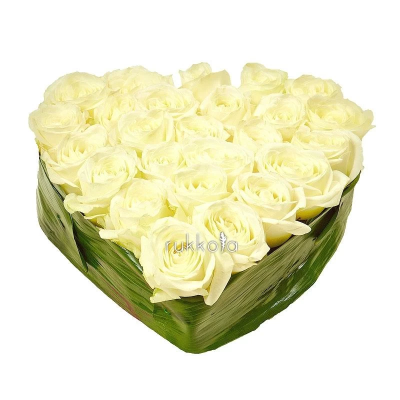 Букет белых роз в виде сердца. 25 отборных роз с доставкой. Флористы соберут букет из роз белого цвета в форме сердца с упаковкой или без, можем сделать в корзине. К цветам добавим конверт с запиской для получателя.