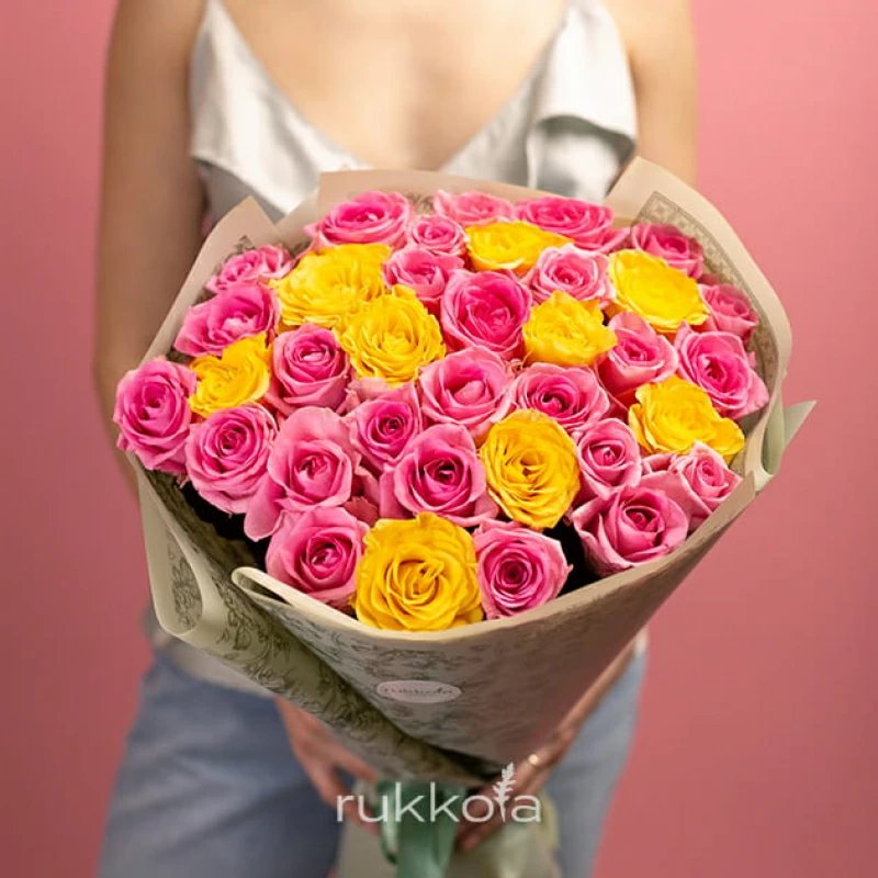 - 35 желтых и розовых роз, выбранной высоты;