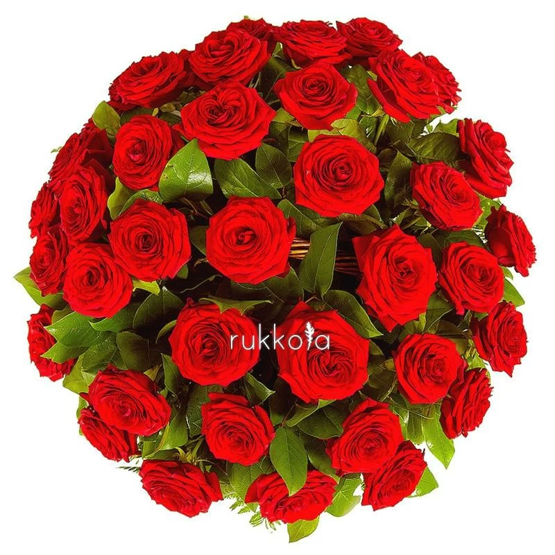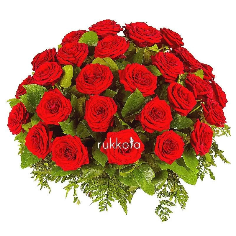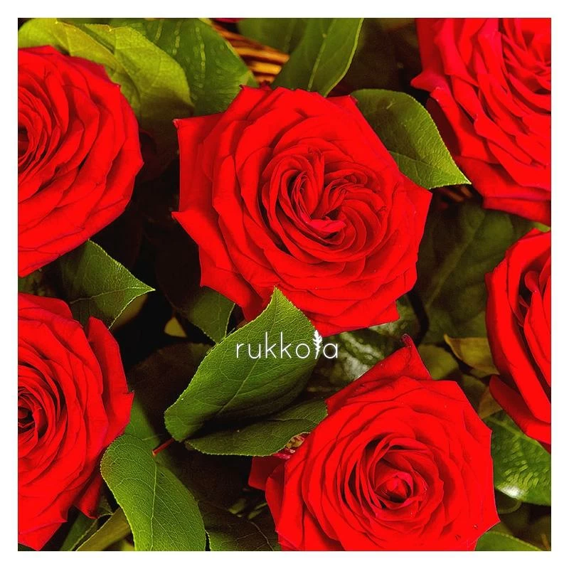 Очень красивый букет в корзине с красными розами и зеленью. Доставка по Москве осуществляется бесплатно. Купить свежие цветы от флористов профессионалов "Руккола".
