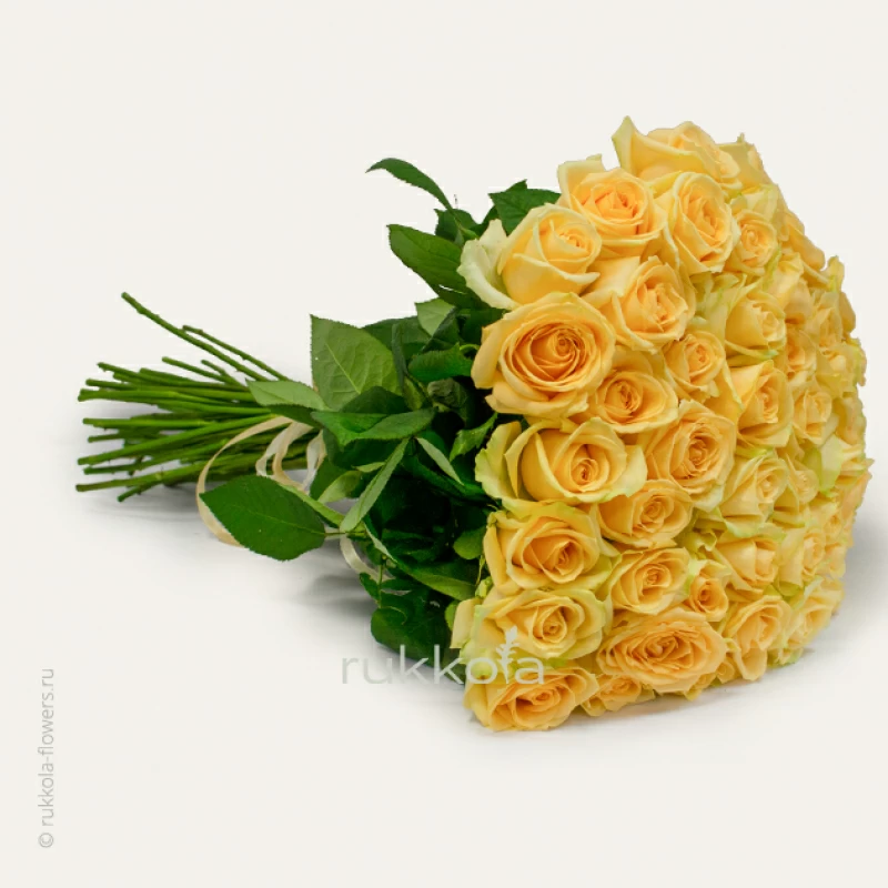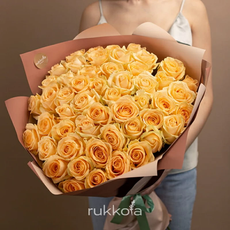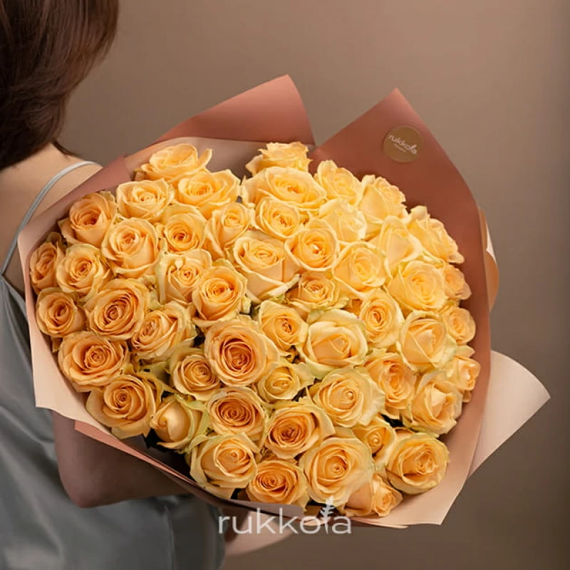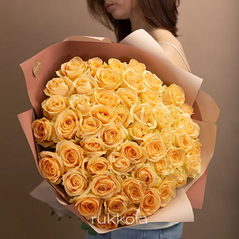 Букет кремовых роз. 51 отборная роза с доставкой. Флористы соберут букет из роз кремового цвета с упаковкой или без, можем сделать в корзине. К цветам добавим конверт с запиской для получателя.