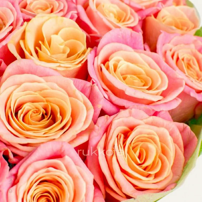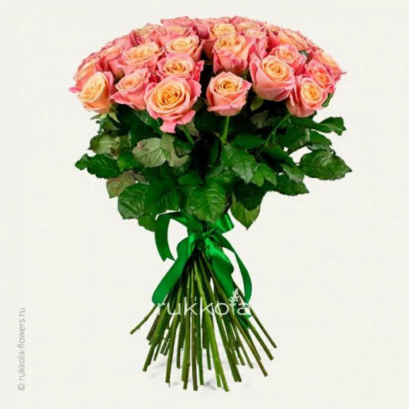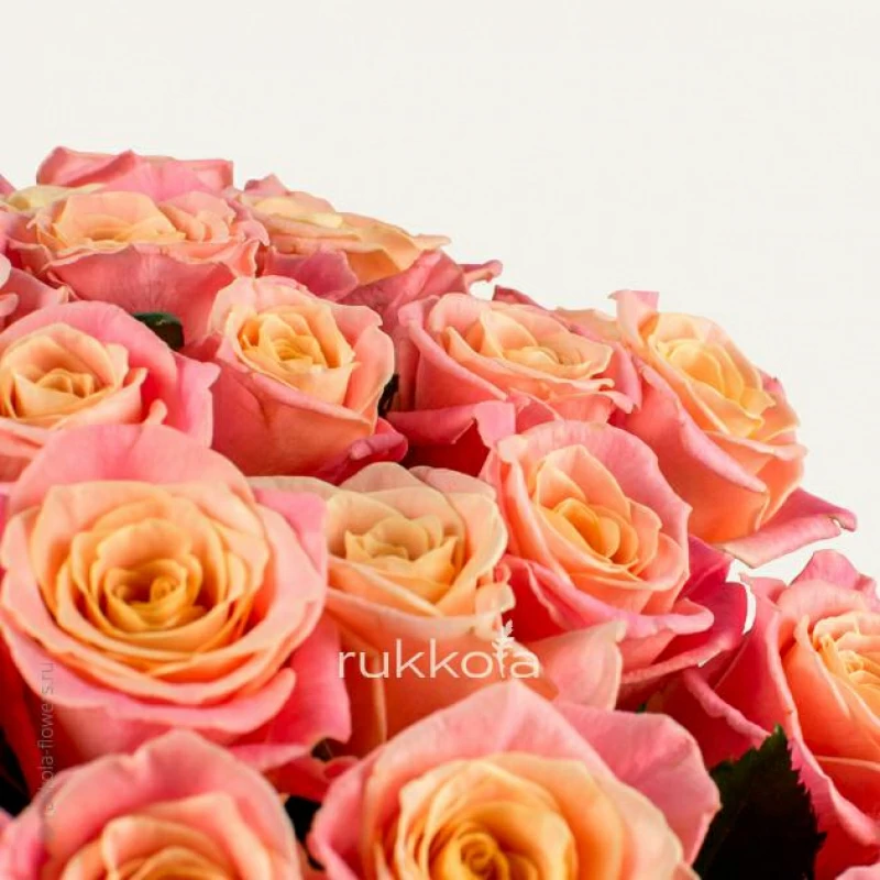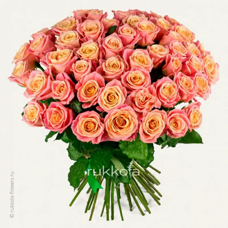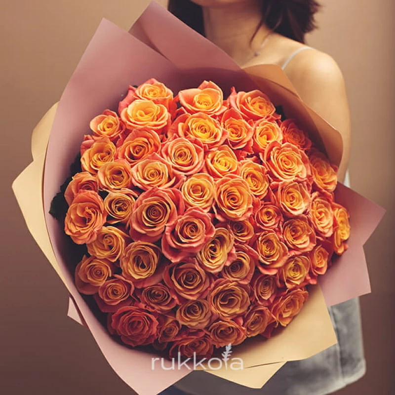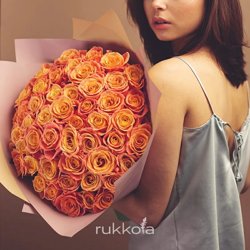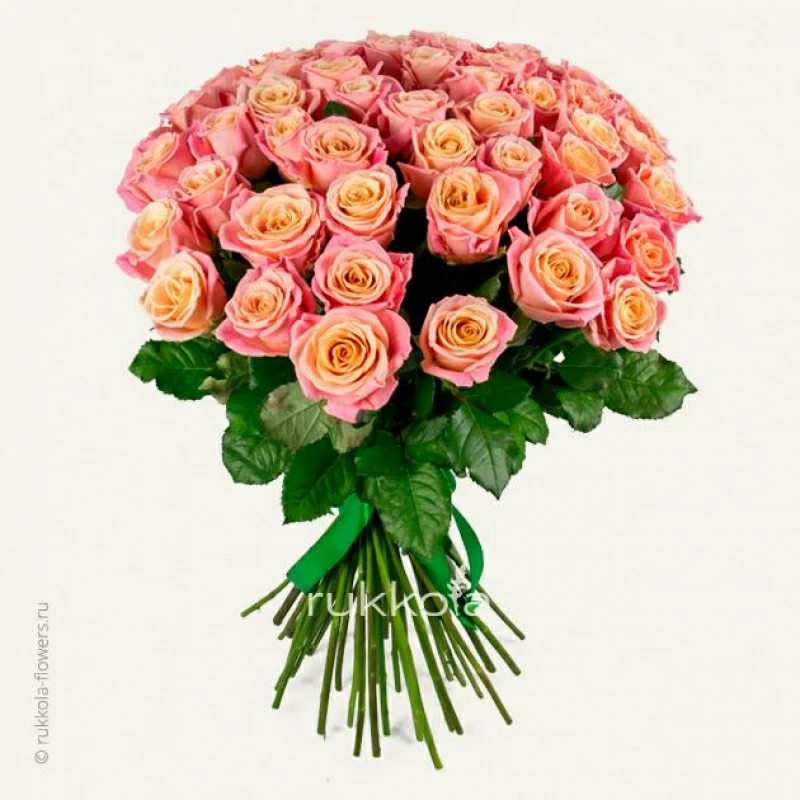 Букет персиковых роз. 51 отборная роза с доставкой. Флористы соберут букет из роз персикового цвета с упаковкой или без, можем сделать в корзине. К цветам добавим конверт с запиской для получателя.