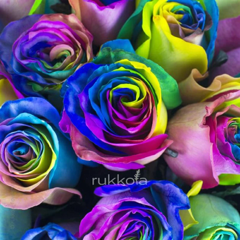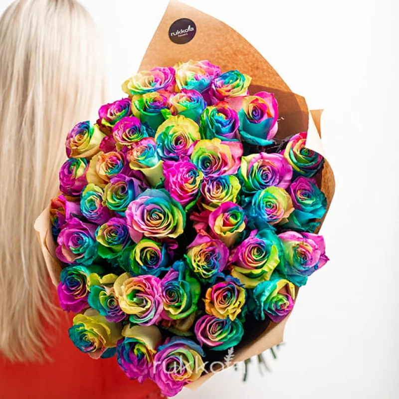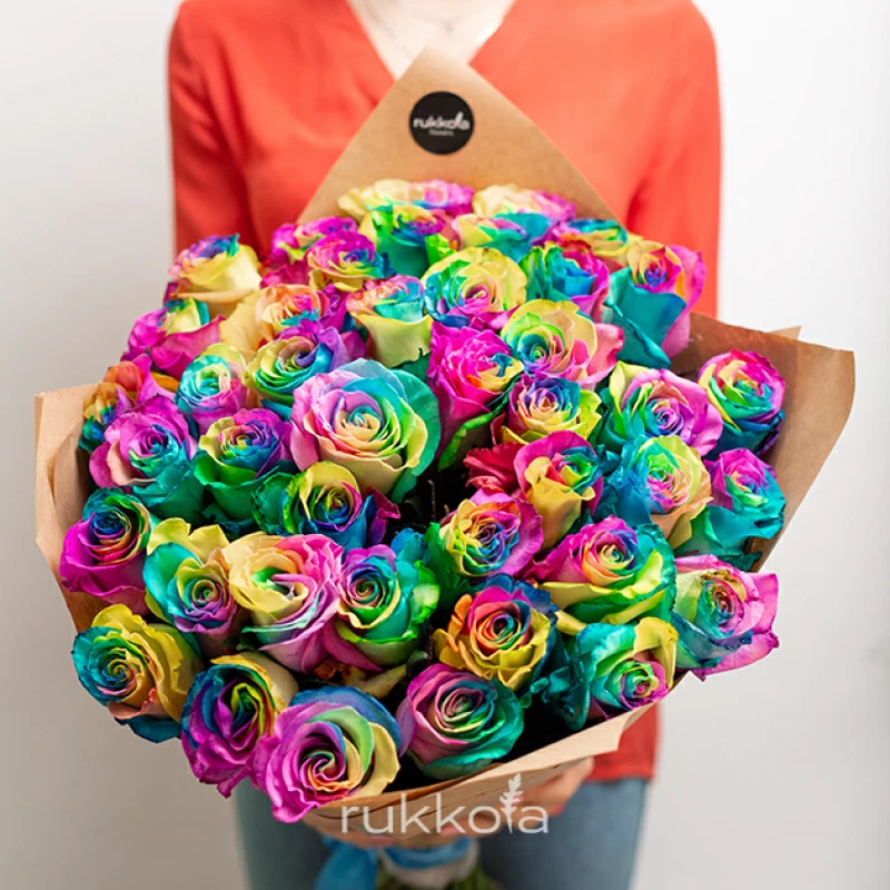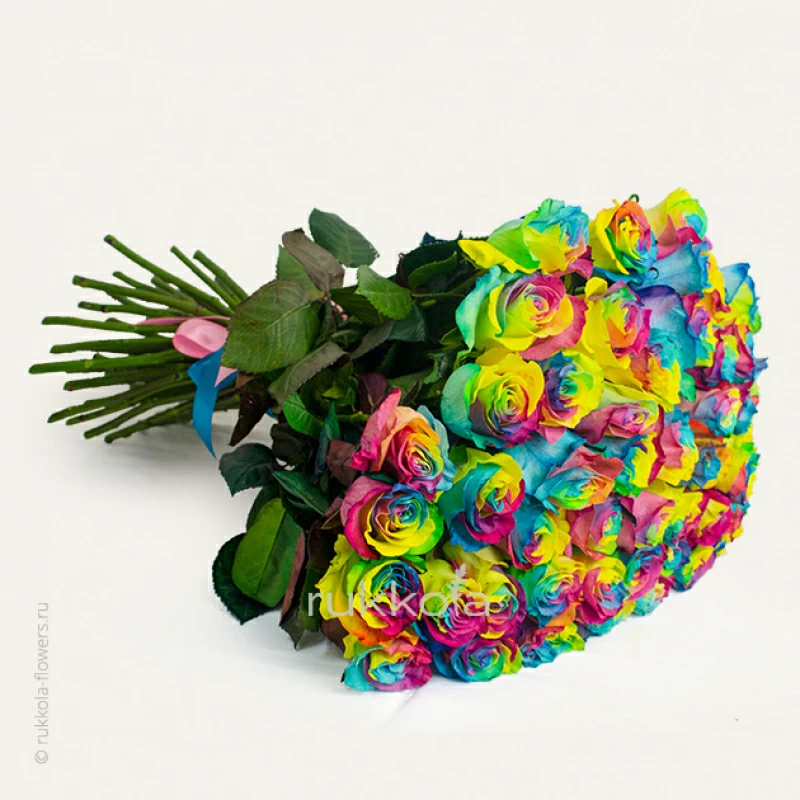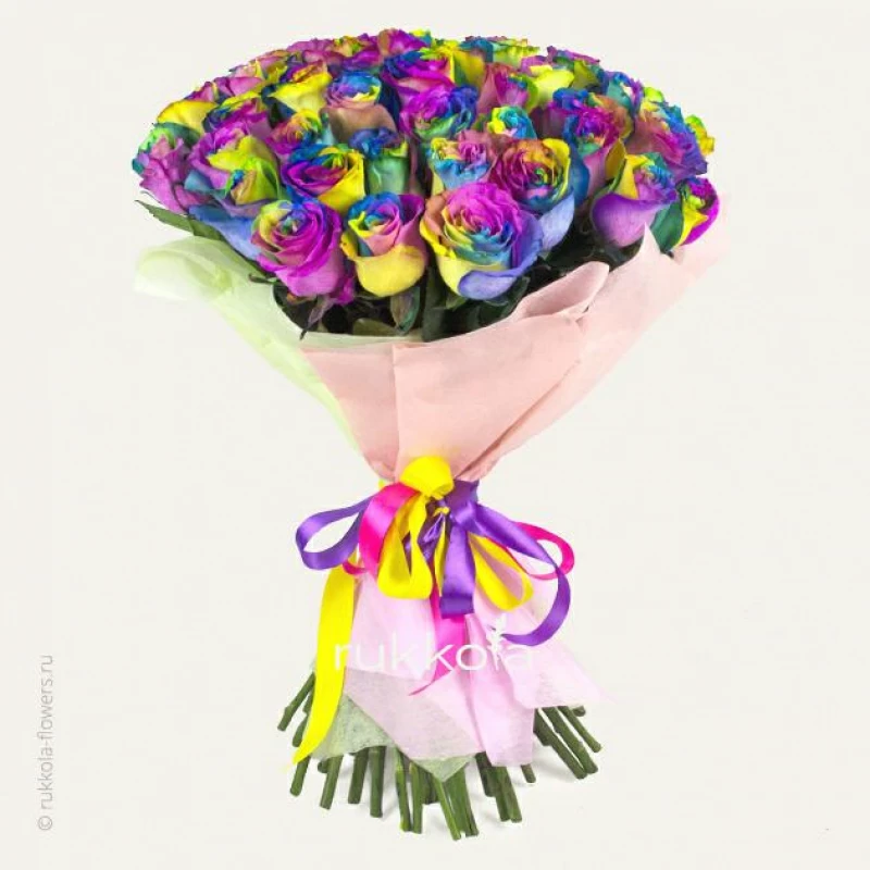 Букет свежих радужных роз. 51 отборный цветок с доставкой. Флористы соберут букет из свежих разноцветных роз. К цветам добавим конверт с запиской для получателя.
