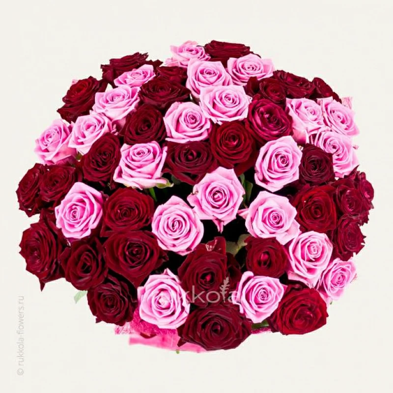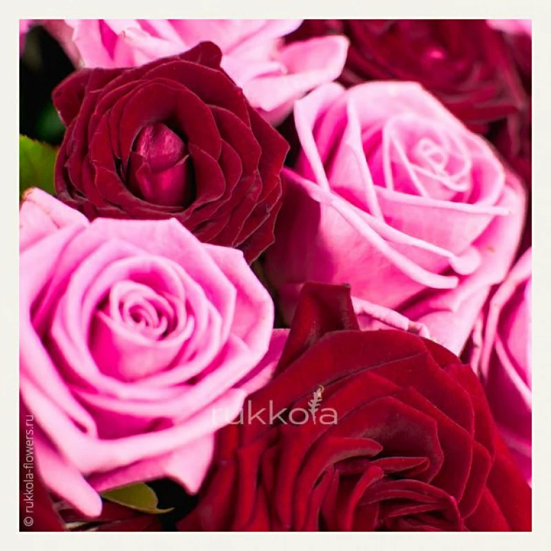 Букет красных и розовых роз. 51 отборная роза с доставкой. Флористы соберут букет из роз красного и розового цвета с упаковкой или без, можем сделать в корзине. К цветам добавим конверт с запиской для получателя.