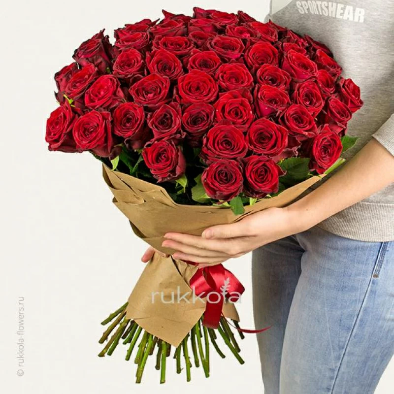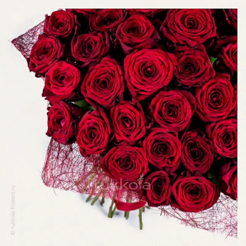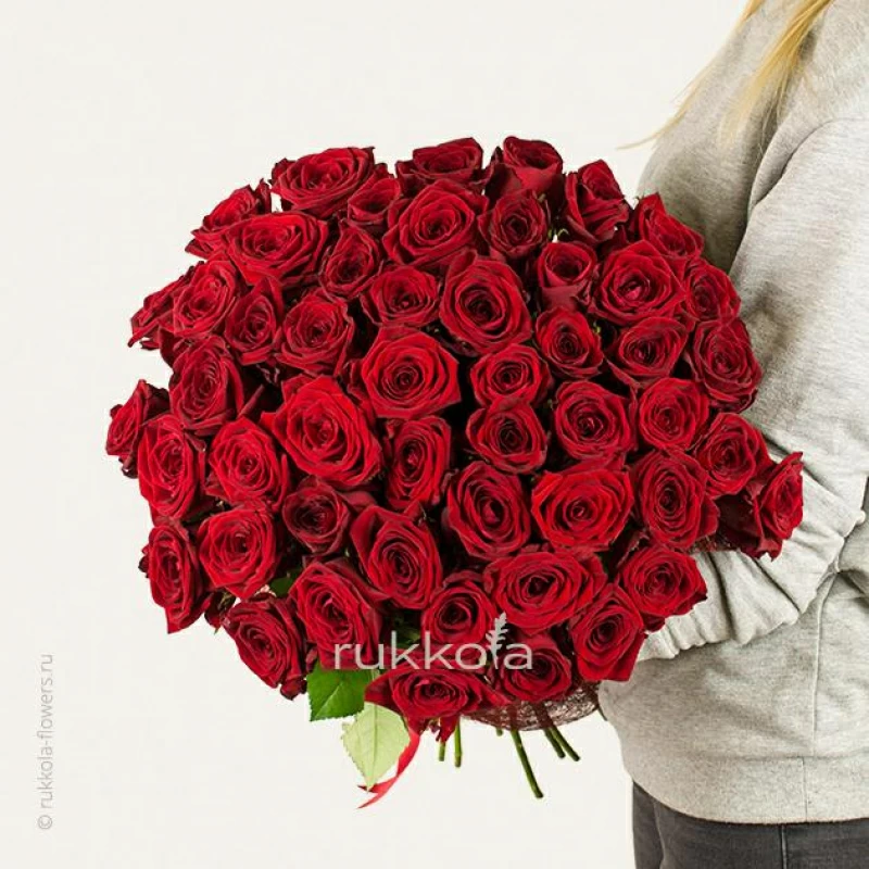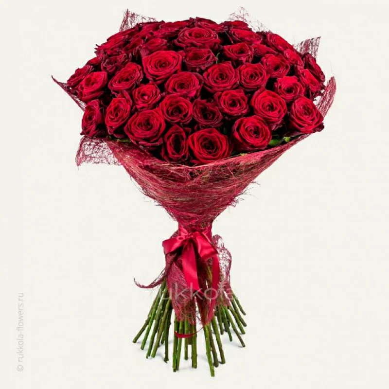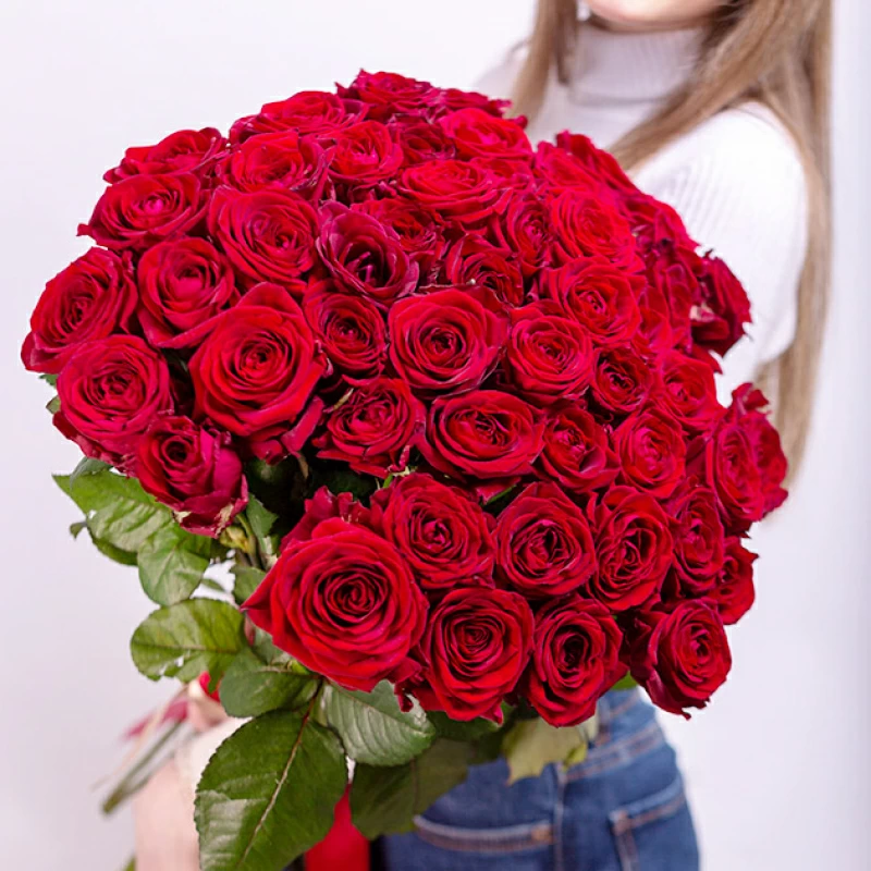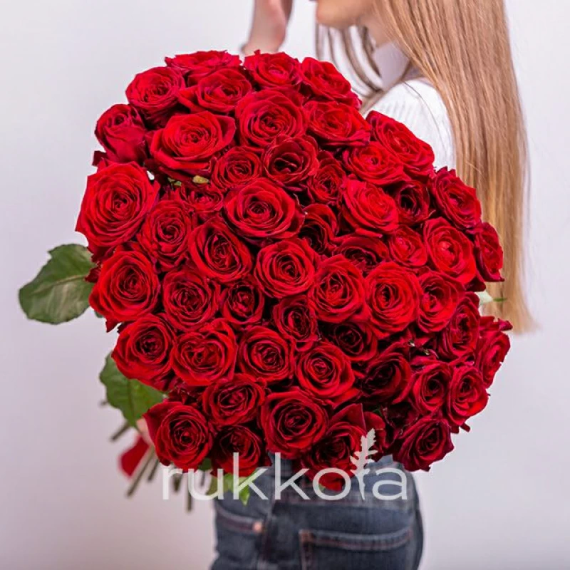 Букет красных роз. 51 отборная роза с доставкой. Флористы соберут букет из роз красного цвета с упаковкой или без, можем сделать в корзине. К цветам добавим конверт с запиской для получателя.
