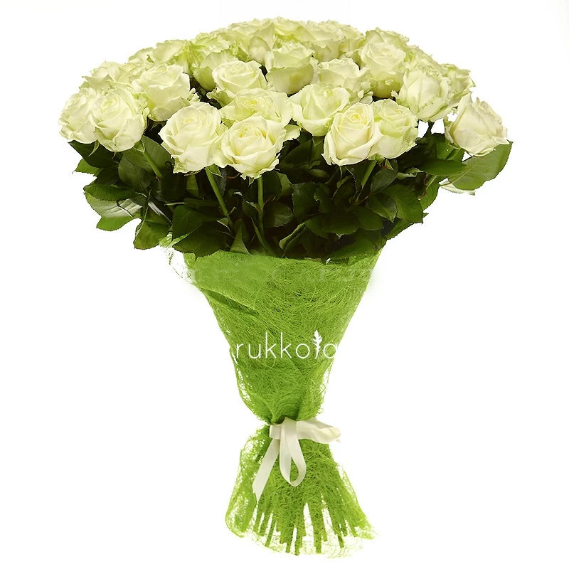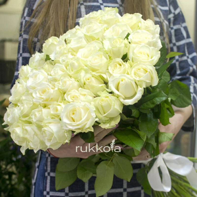 Букет белых роз. 51 отборная роза с доставкой. Флористы соберут букет из роз белого цвета с упаковкой или без, можем сделать в корзине. К цветам добавим конверт с запиской для получателя.