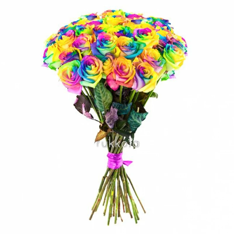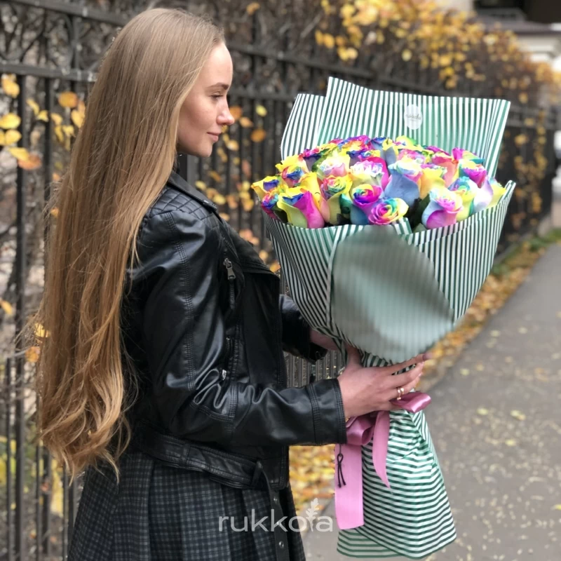 Букет свежих радужных роз. 35 отборных цветов с доставкой. Флористы соберут букет из роз радужного цвета. К цветам добавим конверт с запиской для получателя.