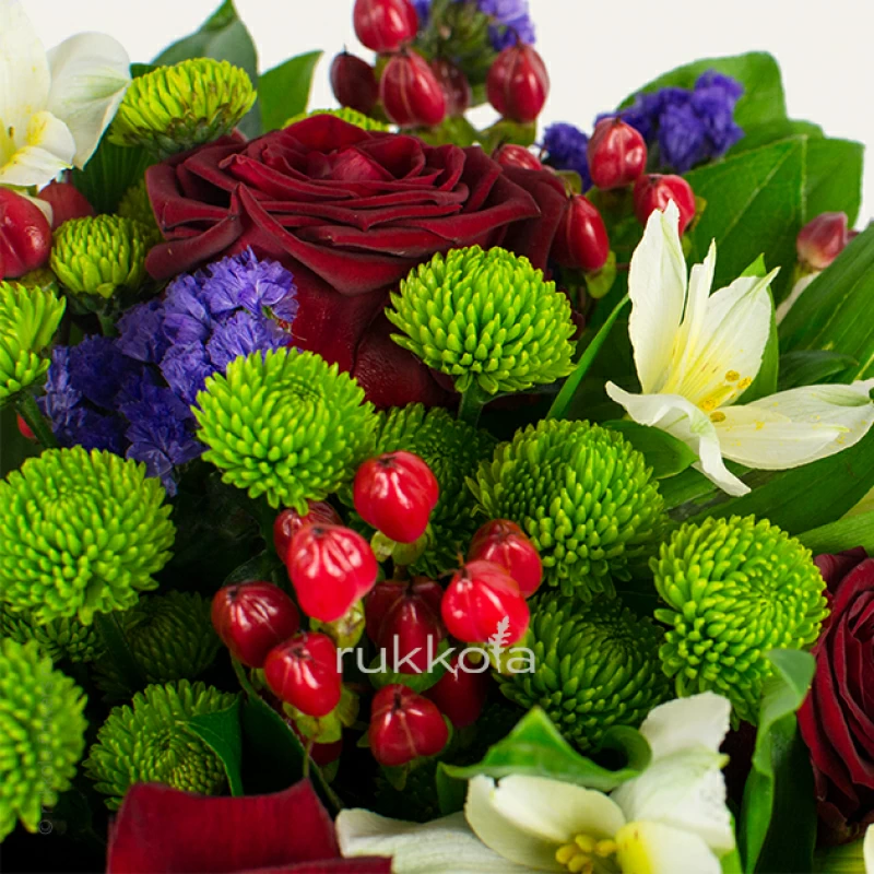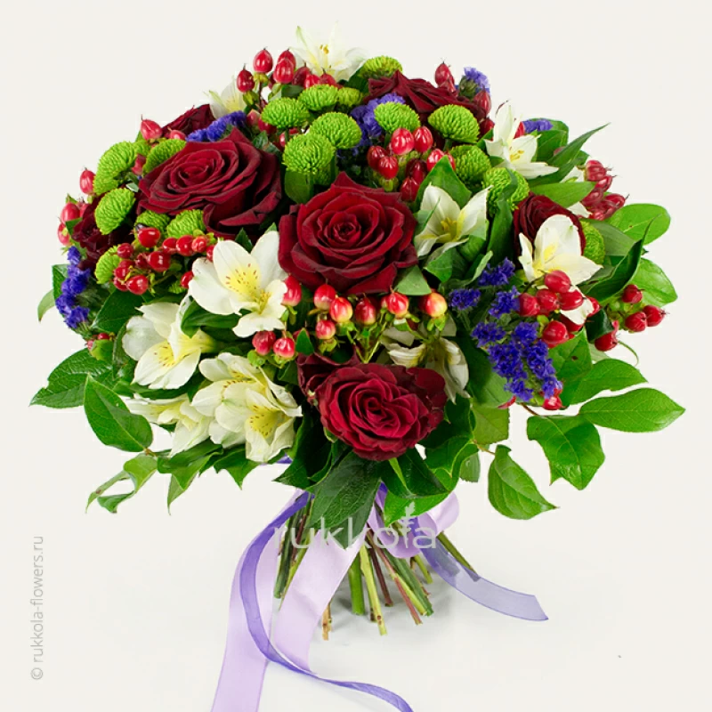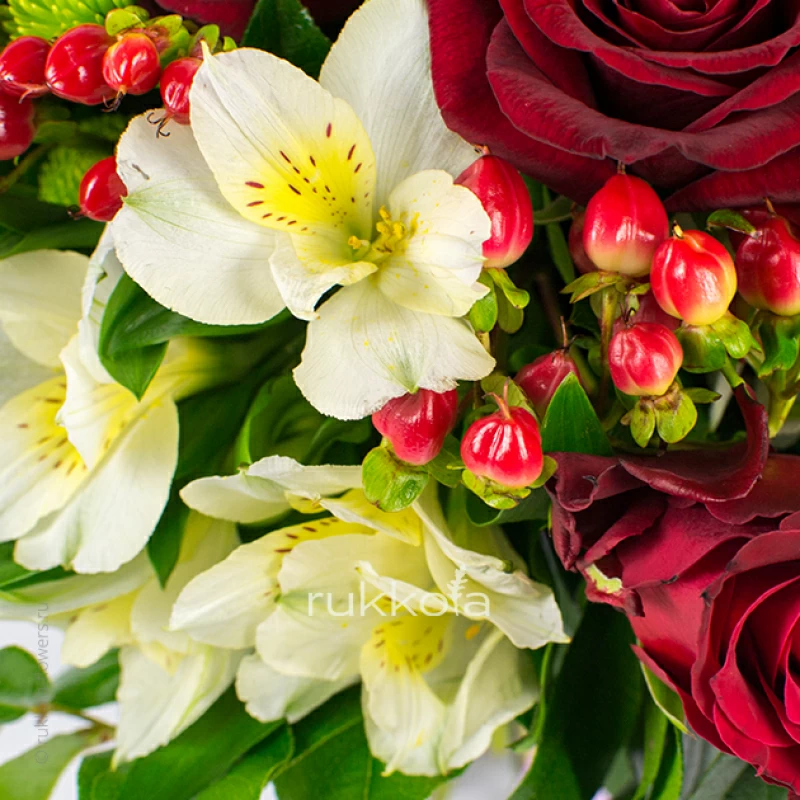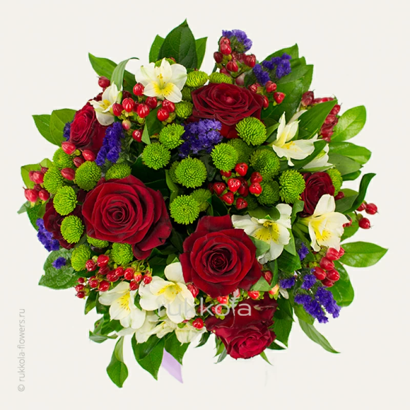 Купить сборный букет из красных роз, альстромерий, хризантем в Москве с доставкой