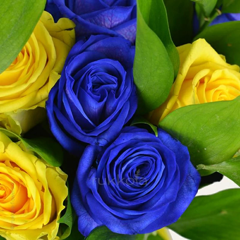 Бесплатная доставка в Москве букета синих и желтых роз. Свежие цветы от флористов "Руккола".