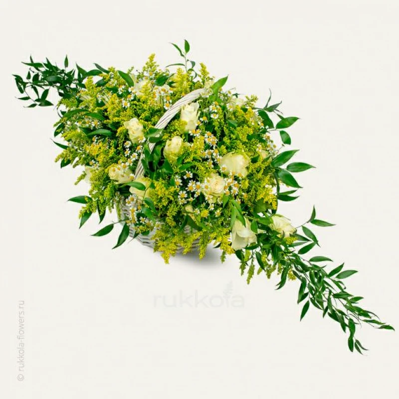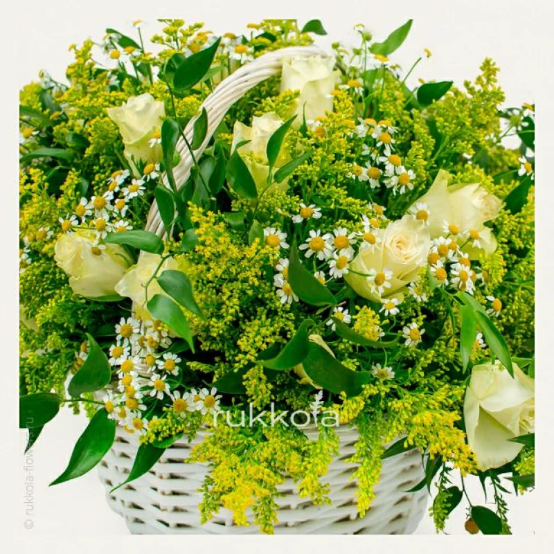 Розы с ромашками и другими цветами в корзине