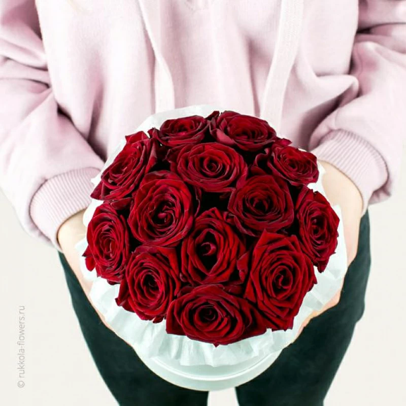 - отборные красные розы, количество зависит от заполняемости и размера бутонов (11-13 шт.);
