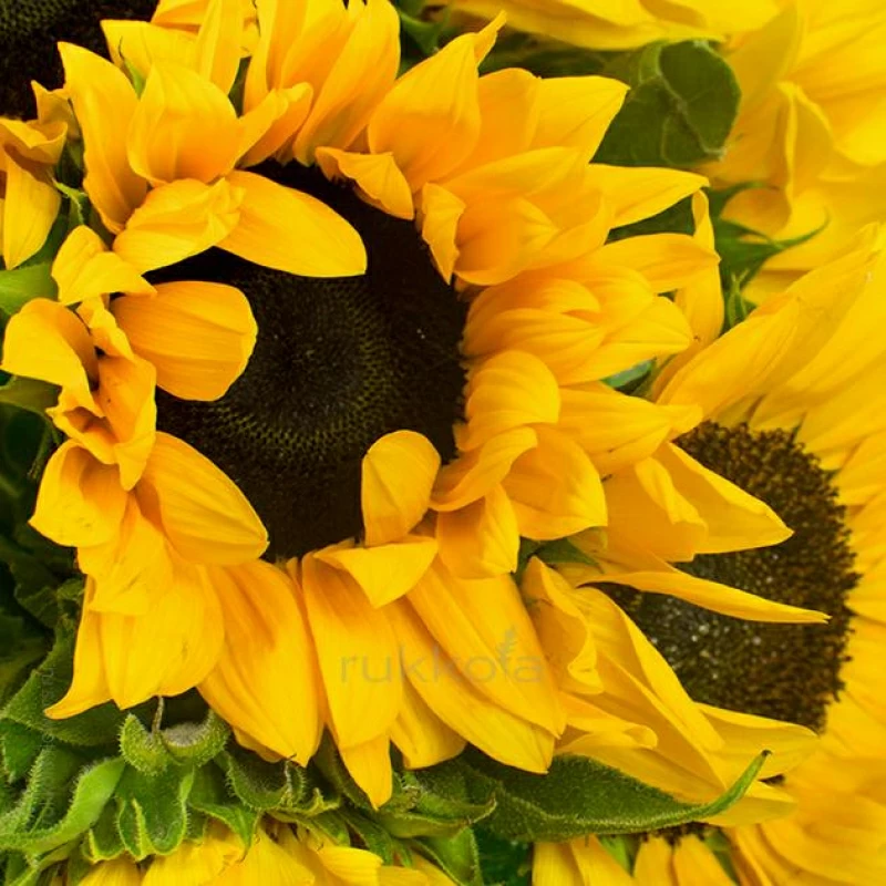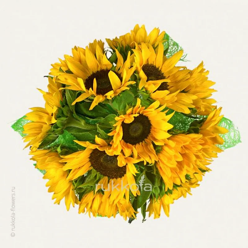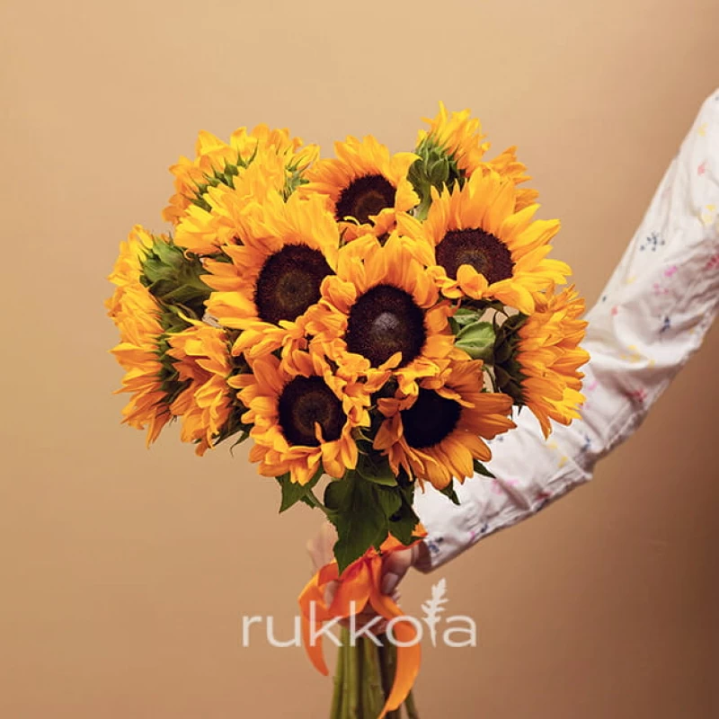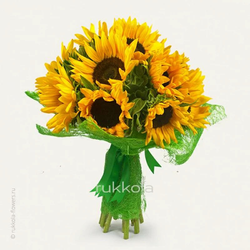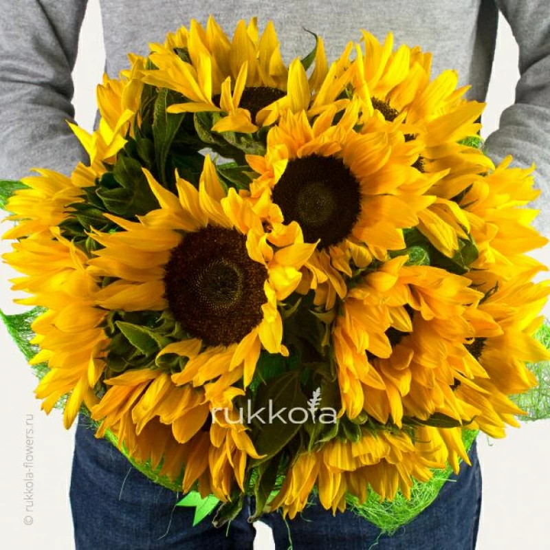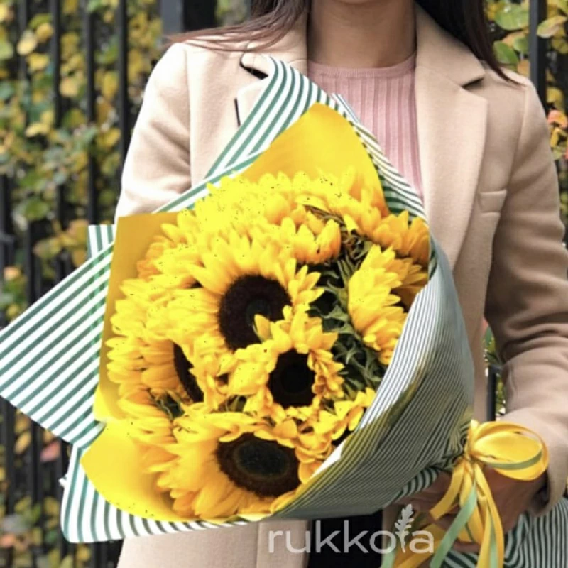 Букет свежих подсолнухов с бесплатной доставкой в Москве по недорогой цене. Купить букет подсолнухи можно в доставке цветов «Руккола» по дешевым ценам в любое время года.