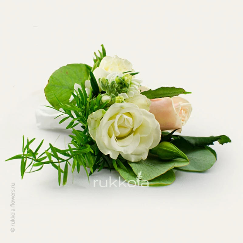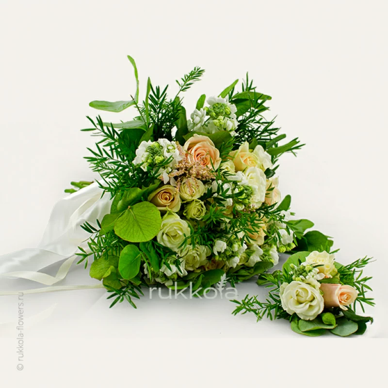 Нежные обычные и кустовые розы с эвкалиптом и другой зеленью