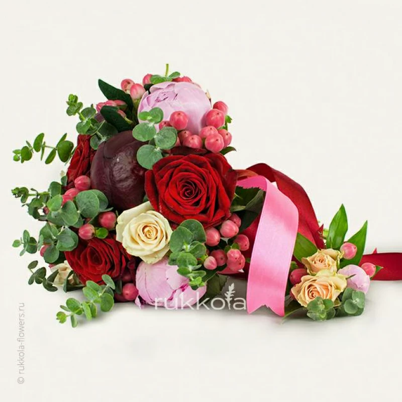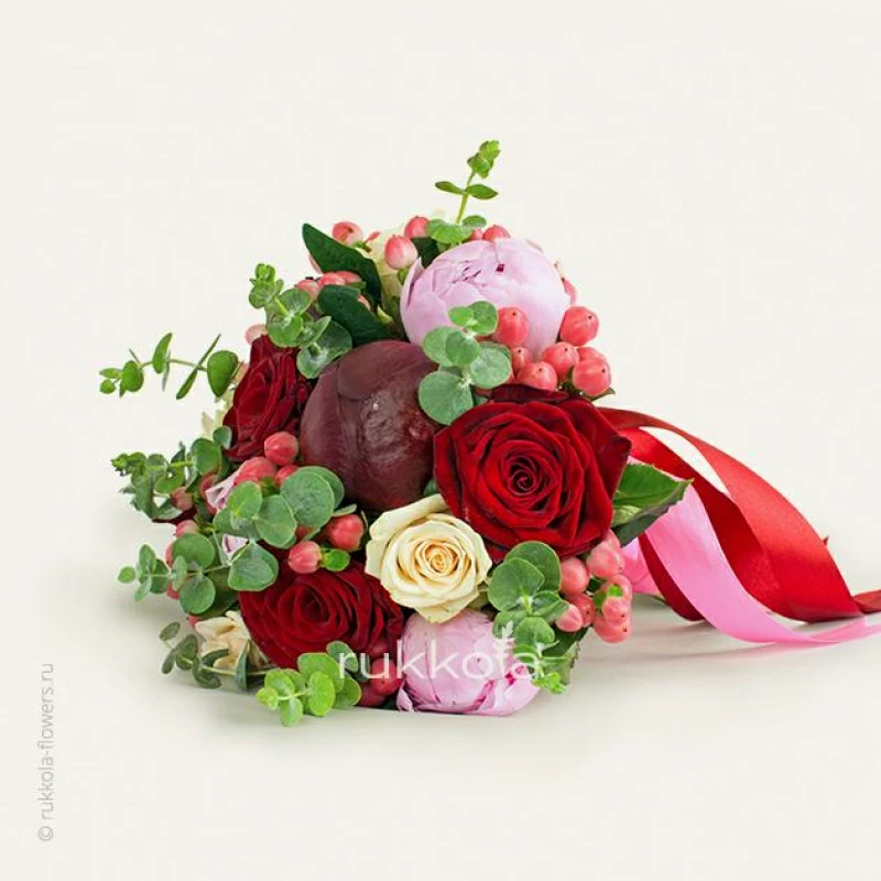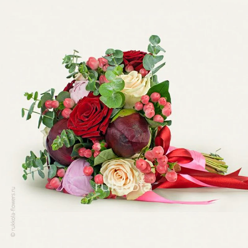 Свадебный букет из свежих пионов и роз с добавлением ягод. Флористы соберут букет на свадьбу из отборных цветов.