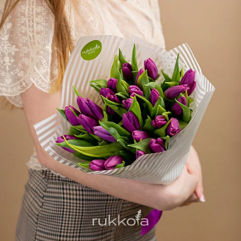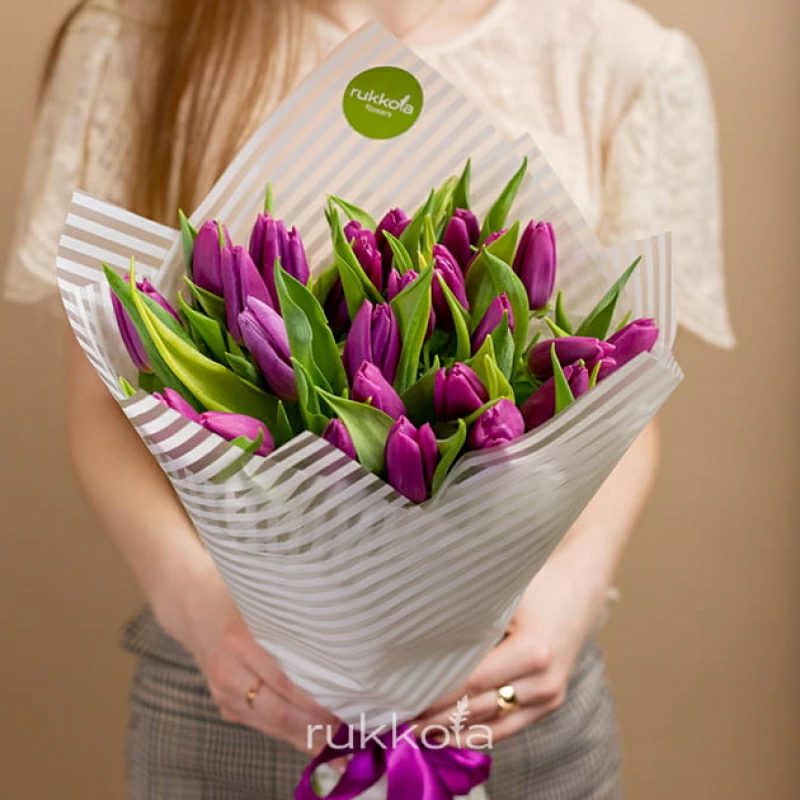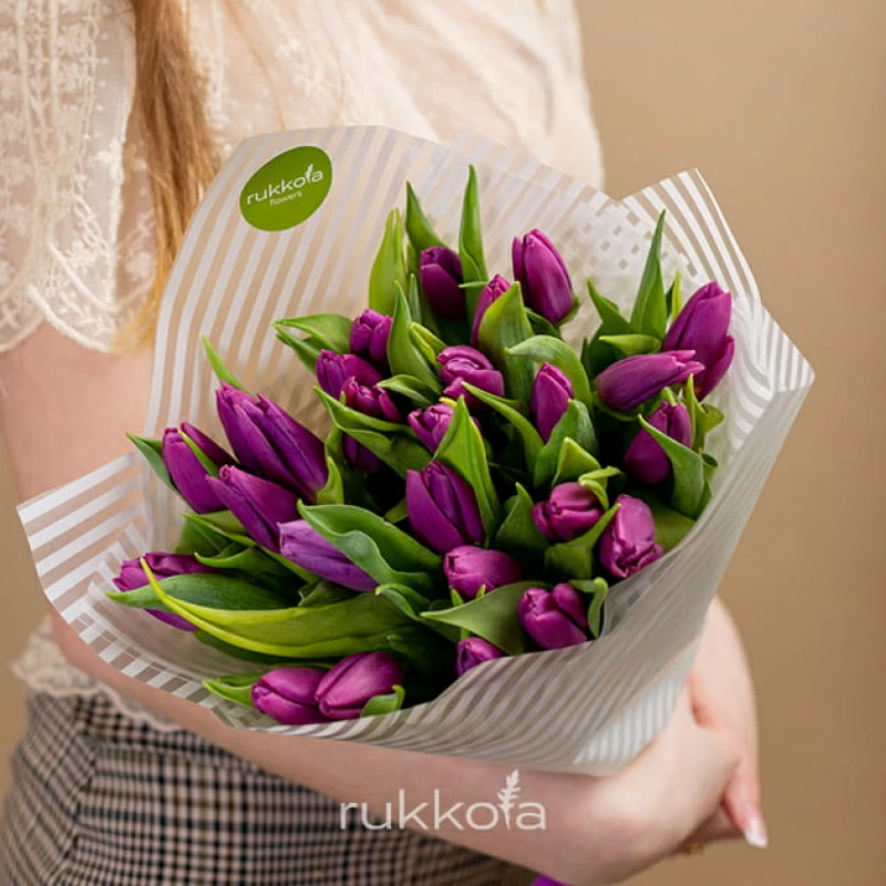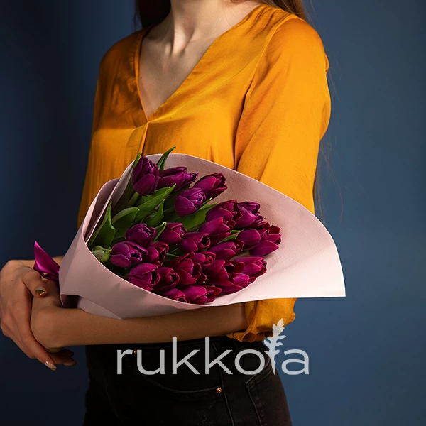 Букет свежих фиолетовых тюльпанов. 25 отборных тюльпанов с доставкой. Флористы соберут букет из тюльпанов фиолетового цвета с упаковкой или без, можем сделать в корзине. К цветам добавим конверт с запиской для получателя.