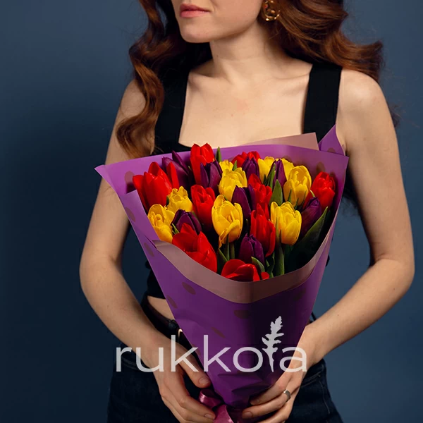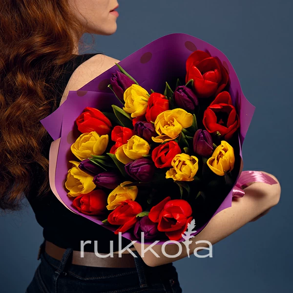 Букет свежих тюльпанов разных цветов с бесплатной доставкой в Москве. Отличные и недорогие цветы от флористов "Руккола".
