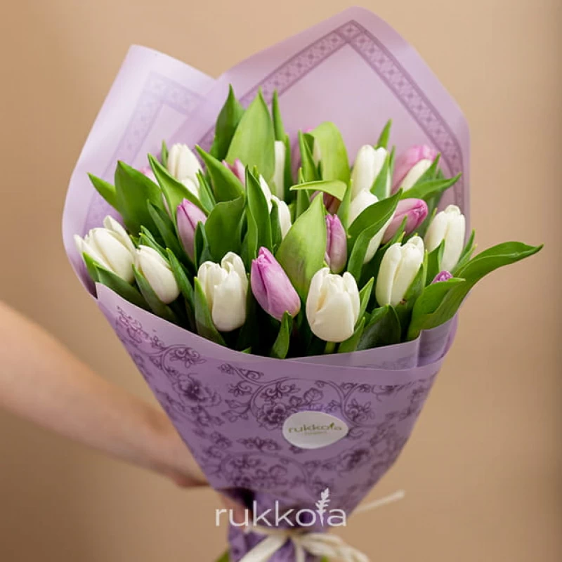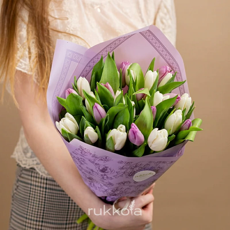 - 25 белых и лавандовых тюльпана;