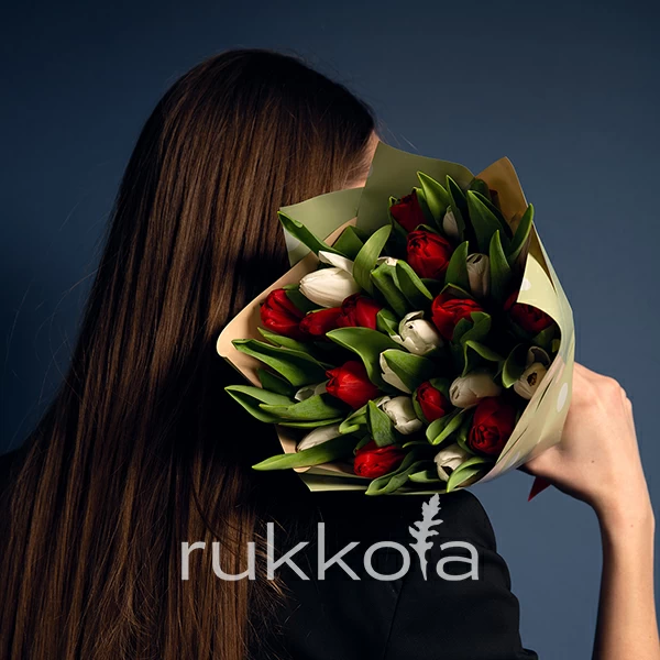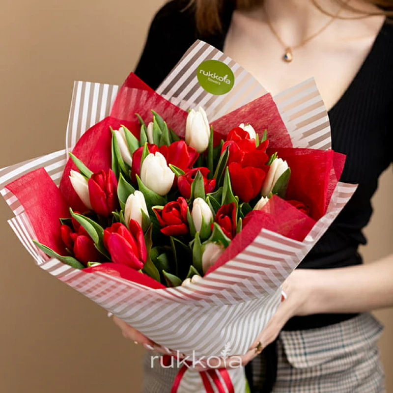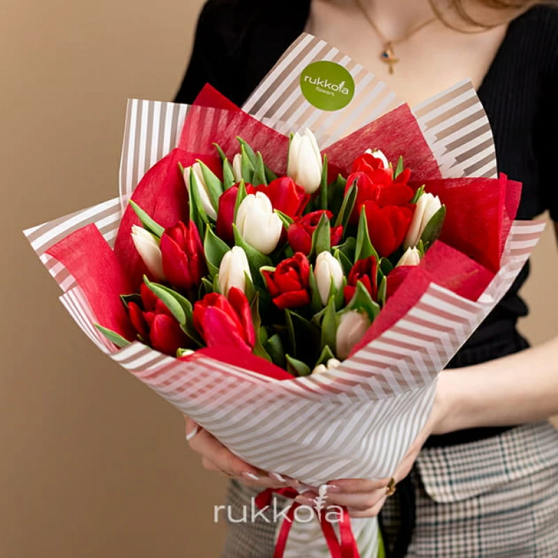 - 25 отборных белых и красных тюльпана;