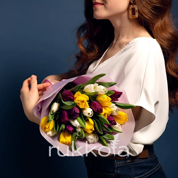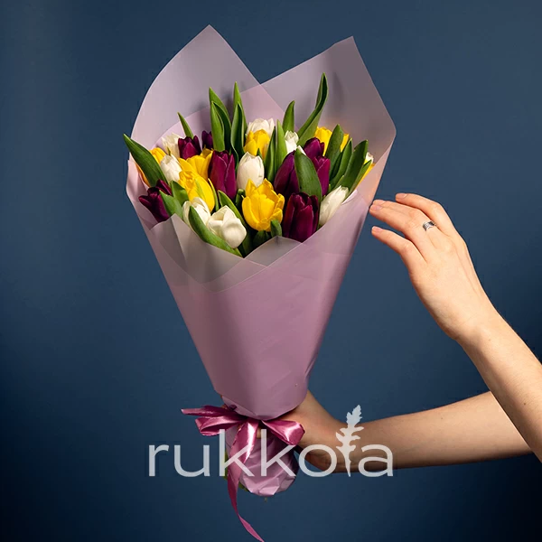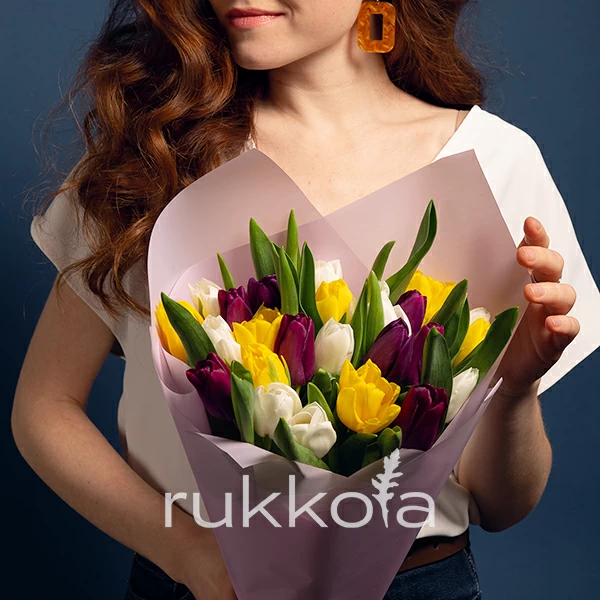 - 25 белых, лавандовых и фиолетовых тюльпанов;