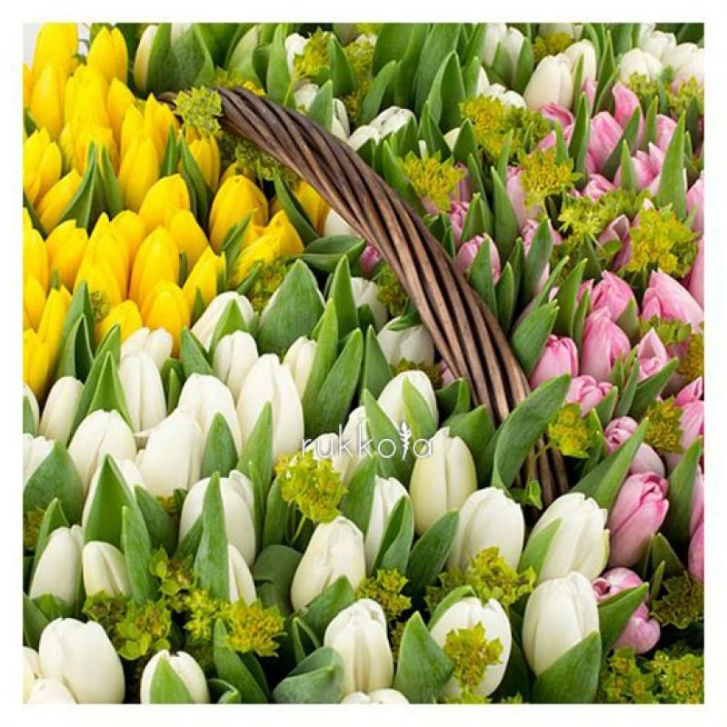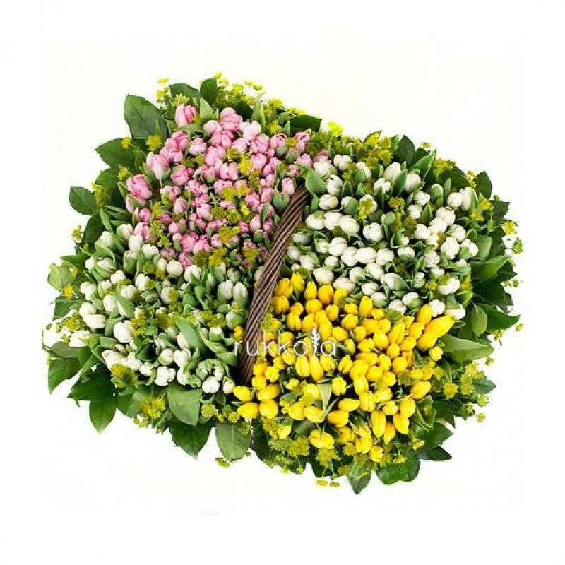 Корзина с 251 тюльпаном. Отборные тюльпаны с бесплатной доставкой в Москве. К цветам добавим конверт с запиской для получателя.