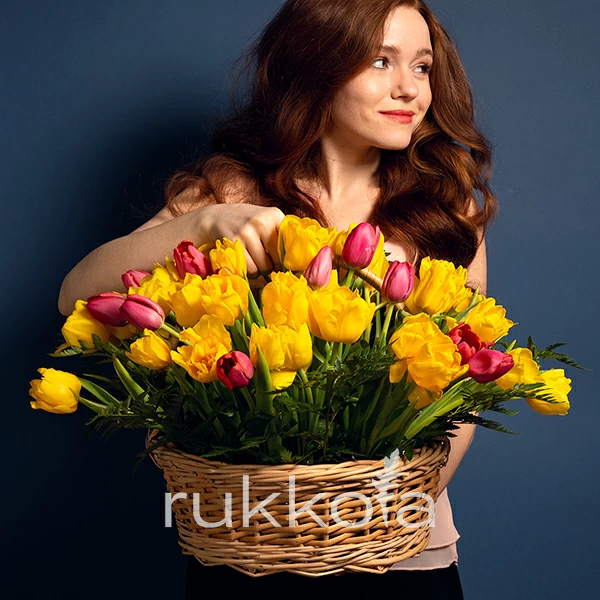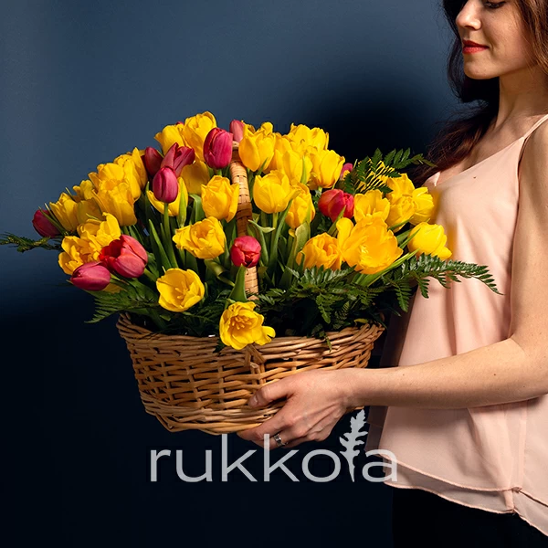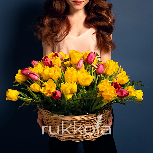 Корзинка со свежими тюльпанами разного цвета. Отборные цветы напрямую от флористов с бесплатной доставкой в Москве. цветам добавим конверт с запиской для получателя.
