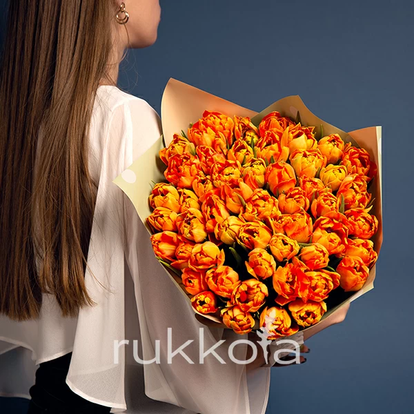 Букет оранжевых тюльпанов. 51 отборный тюльпан с доставкой. Флористы соберут букет из тюльпанов оранжевого цвета с упаковкой или без, можем сделать в корзине. К цветам добавим конверт с запиской для получателя.