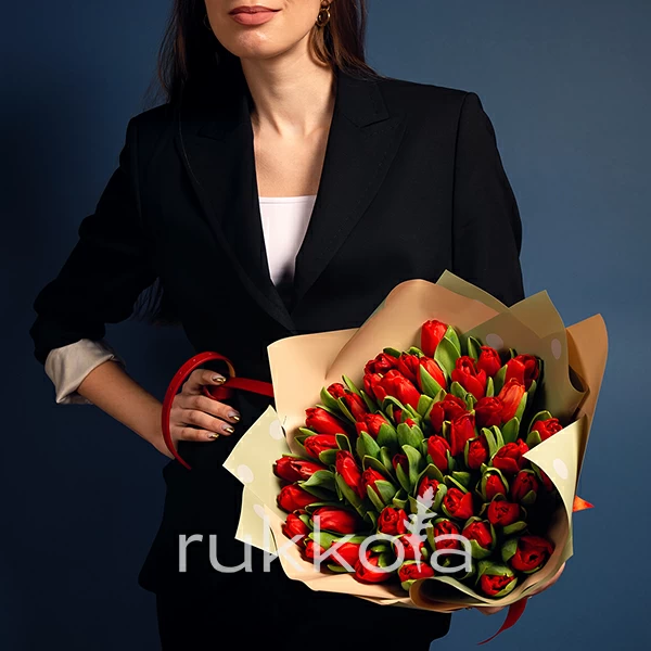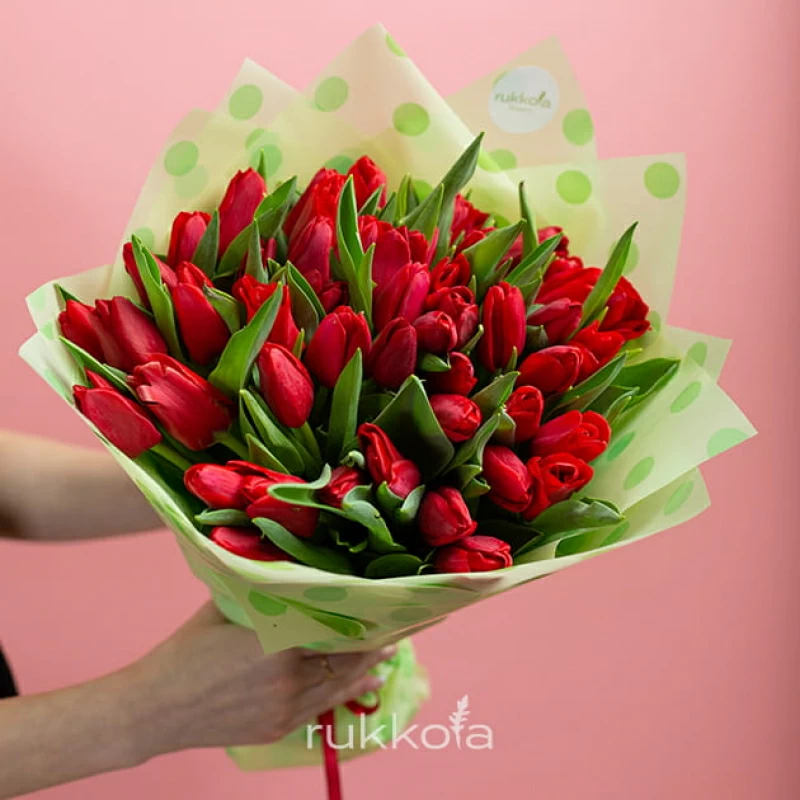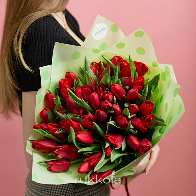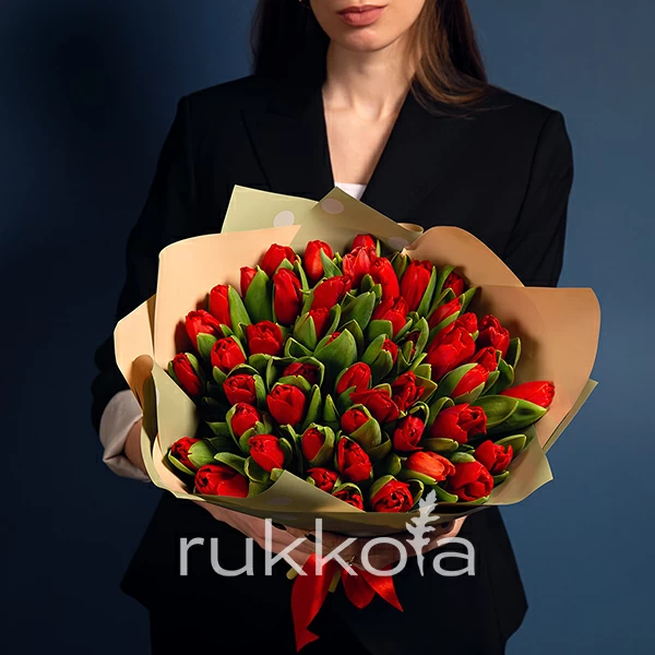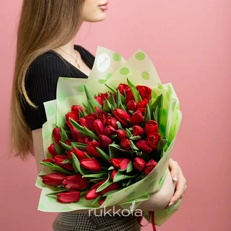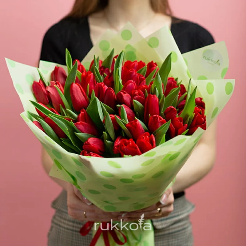 Букет красных тюльпанов. 51 отборный тюльпан с доставкой. Флористы соберут букет из тюльпанов красного цвета с упаковкой или без, можем сделать в корзине. К цветам добавим конверт с запиской для получателя.