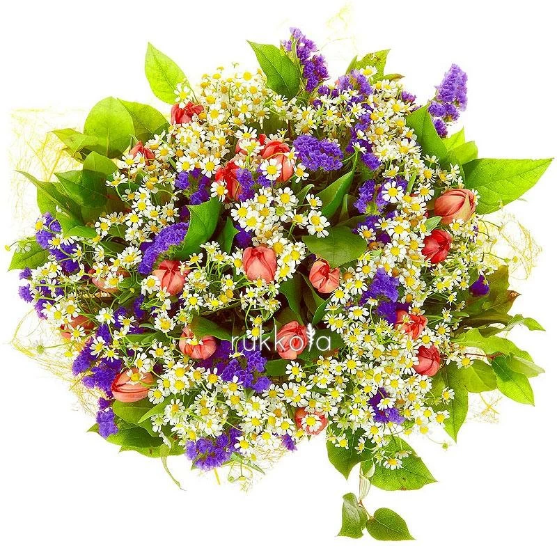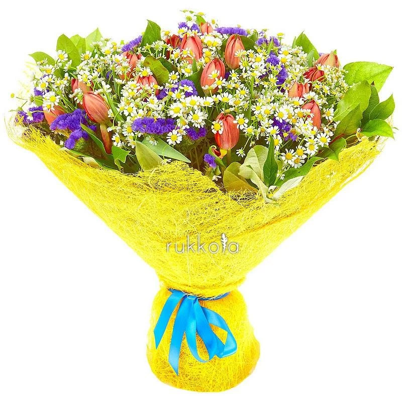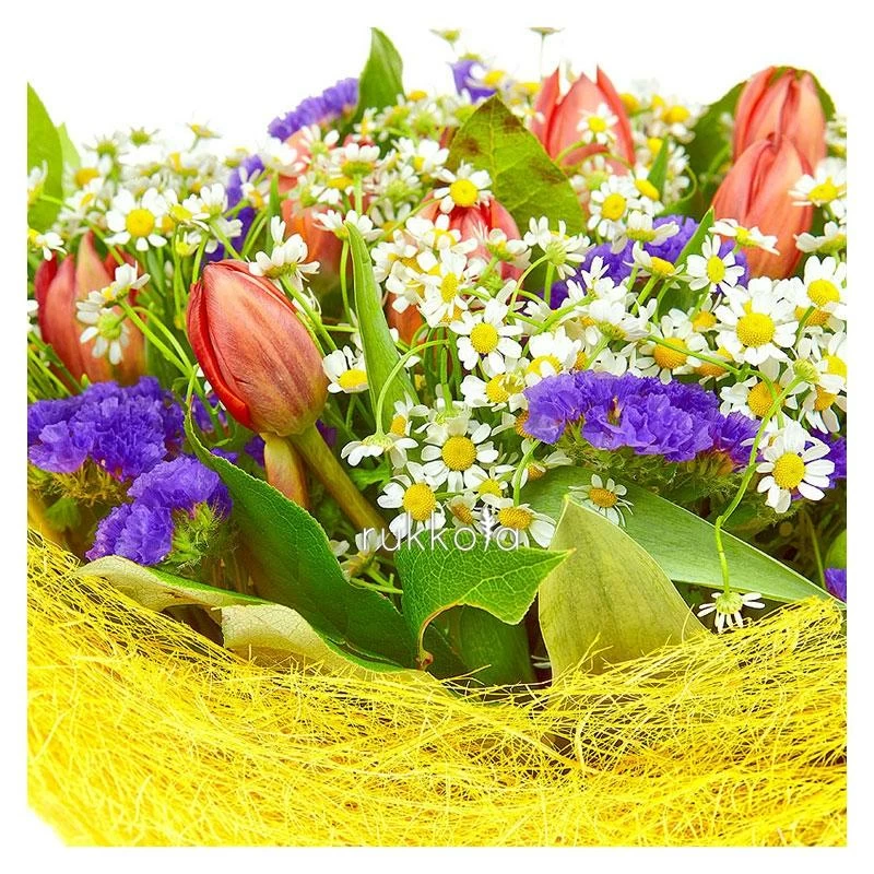 Очень весенний и даже немного лесной букет цветов. Свежие ромашки и тюльпаны делают букет ярким и незабываемым.